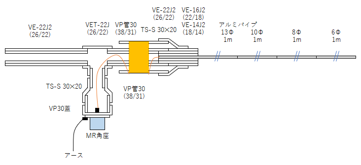パイプ内の配線は引き回しに柔軟性が欲しかったのでAWG16のビニル電線を使用し、先端に丸形端子を圧着